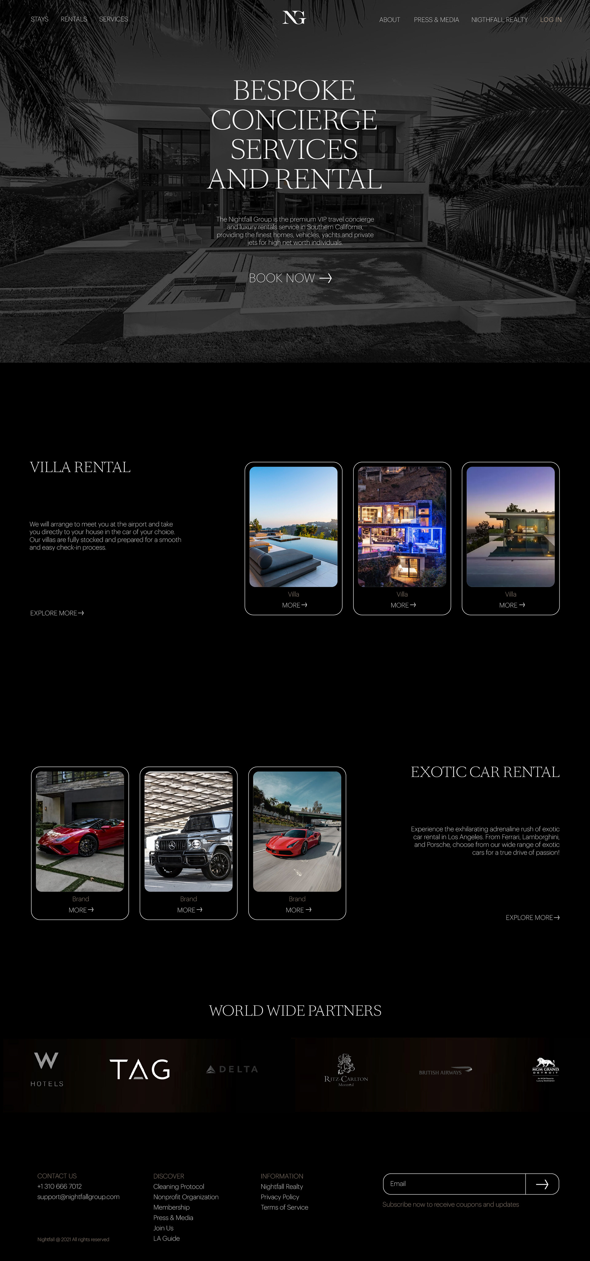 The website and social media design for Night Fall Group, the company of premium travel concierge and luxury rental services.